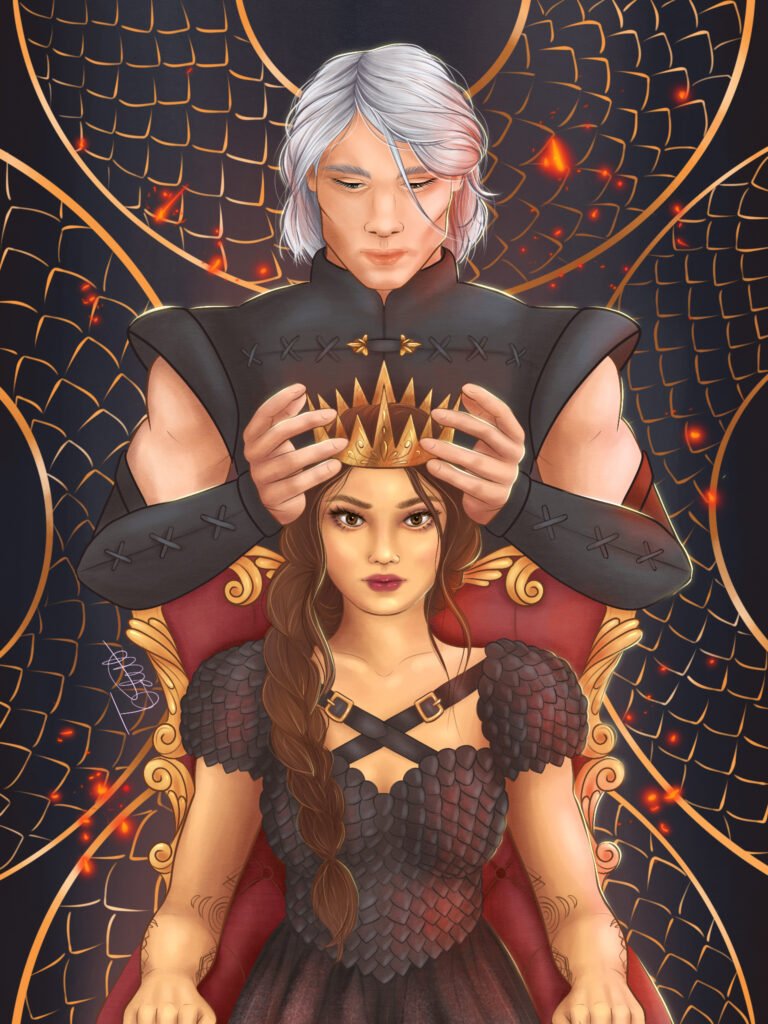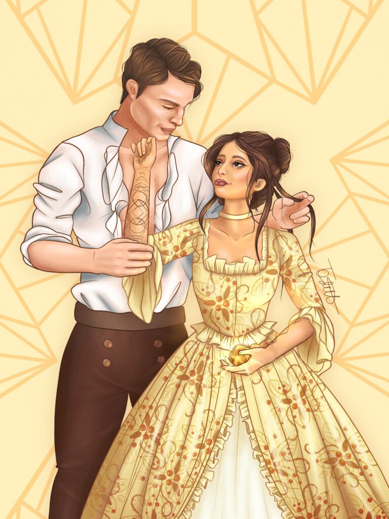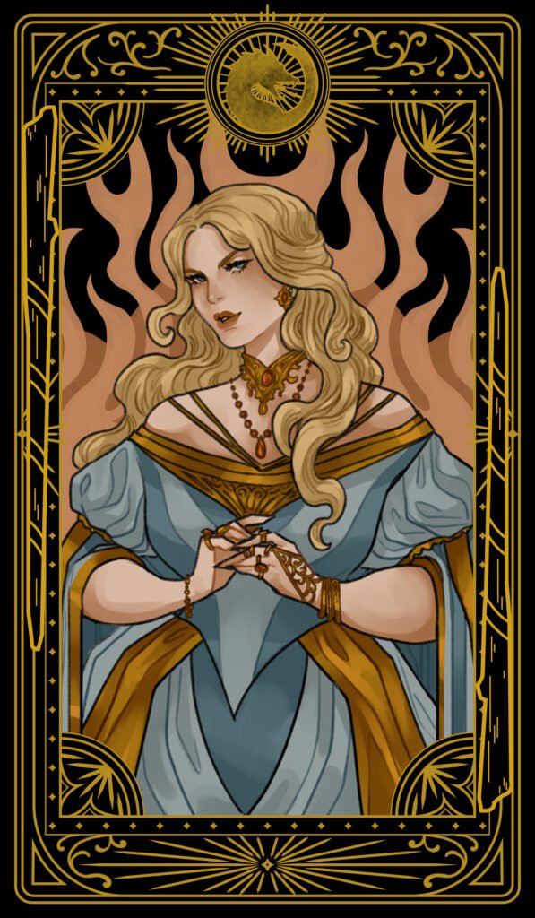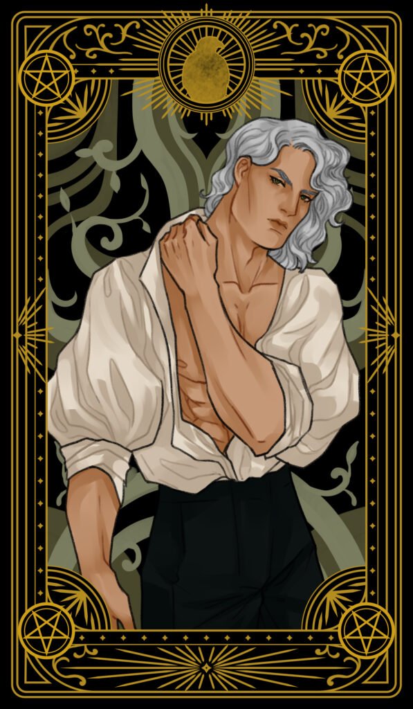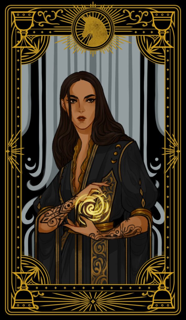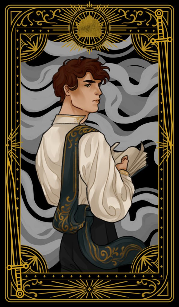 Images 1-4 tarot character cards by Bon Orthwick @monolimeart (based on characters and elements from Book Three: A Fate of Flame)